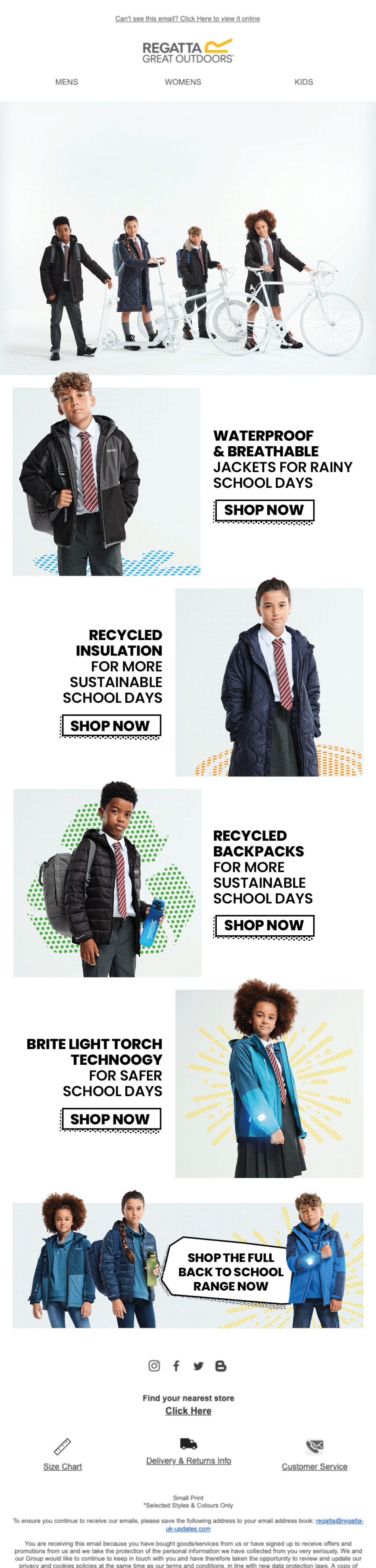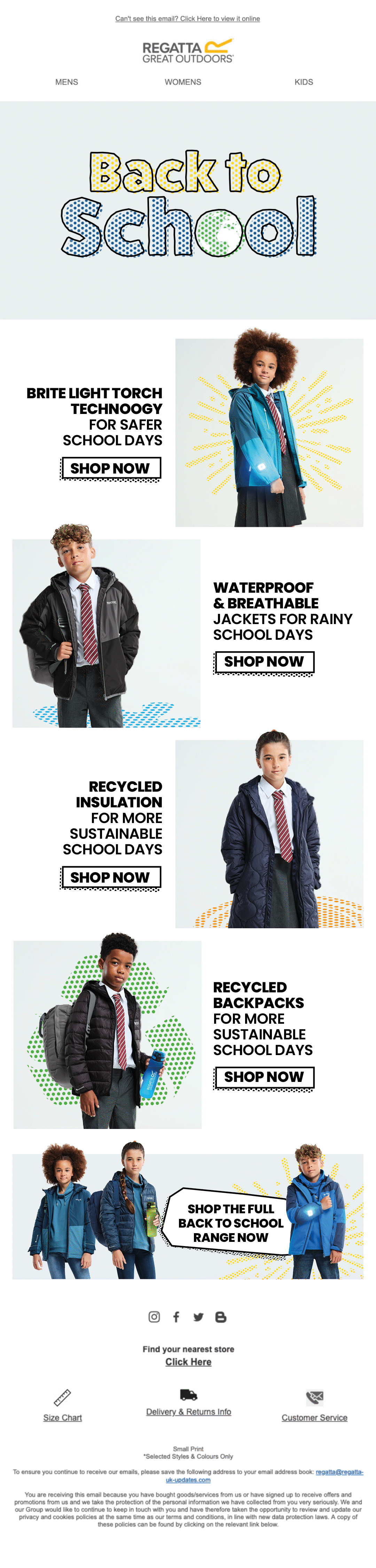 Regatta Great Outdoors Back to school campaign aimed at creating a campaign that can reach all age demographics within school as well as making parents interested. These had to relate to Local and European schools where uniforms might not be enforced therefore seperate assets would be needed for each.